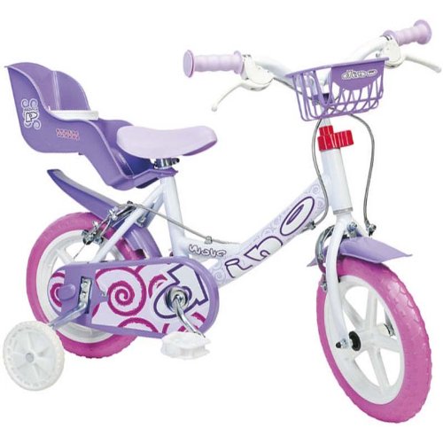- VÉLO 12 POUCES BLANC/CASSIS : Pneus pleins, jantes bâtons diam. 30 cm. Roulements nylon, selle et guidon réglables, stabilisateurs amovibles. 2 freins, pignon fixe à l'arrière, kit d'éclairage inclus. Garde-boue et siège de poupée à l'arrière. De 3 à 6 ans (pour enfants de taille 87 à 120 cm).