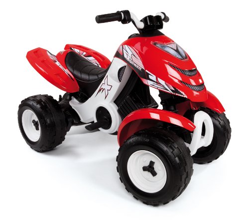 Avec ce quad électronique, tu prendras assurément la première place de la course ! Avec son look de voiture de course, le quad "X-Power" de Smoby est un véhicule électronique aux multiples facettes : pour un plaisir de jeu durable et sans contraintes. Ce superbe quad rouge plaira aux petits pilotes en herbe ! Avec une carrosserie particulièrement solide au design inspiré des vrais quads d'adultes. Matière : plastique Caractéristiques : propulsion par 2 roues roues en plastique très épaisses et solides, avec de larges crampons volant tenant bien en main avec un bouton d'accélération sur la droite à manipuler avec le pouce vitesse progressive avec une vitesse maximale de 5 km/h comprend une batterie de 6 Volt d'une autonomie de 2 heures batterie rechargeable chargeur inclus